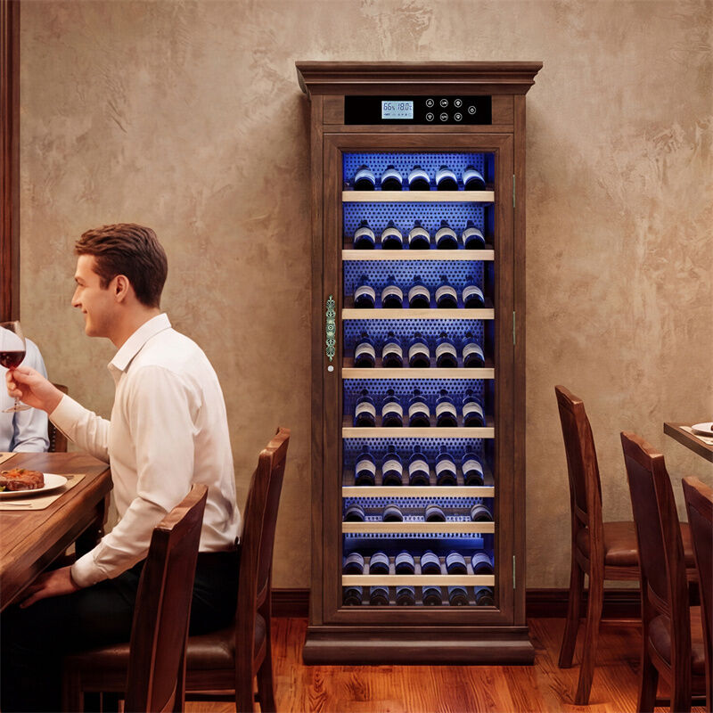 With a generous 70-bottle capacity and adjustable wooden shelves, it accommodates everything from standard Bordeaux bottles to larger Burgundy and champagne bottles. The digital temperature control panel and easy-to-read LED display make operation simple, while the built-in fan ensures uniform air circulation throughout the cabinet, eliminating hot spots.